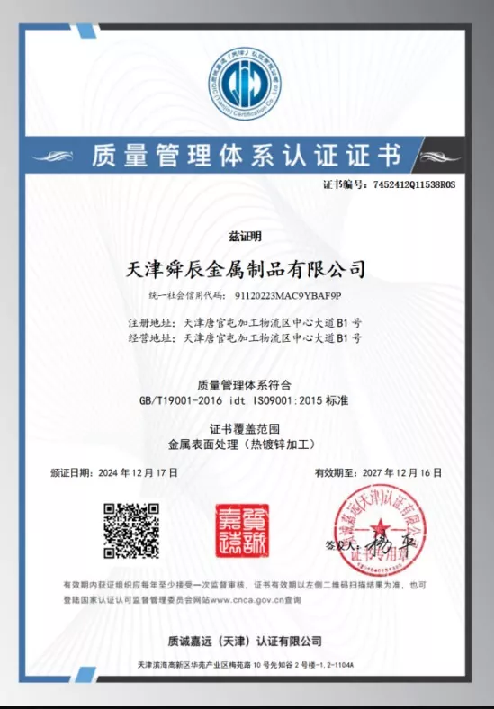 1. Proses teras: Proses penyaduran rendaman suhu tinggi, substrat pra dirawat dengan bantuan pencucian asid, penyahgaraman dan penyaduran, dan kemudian direndam dalam larutan zink cair. Lapisan zink diikat secara metalurgi pada substrat, dengan tahap lekatan 1; 2. Parameter utama: Ketebalan lapisan zink ≥ 85 μ m (konvensional), boleh disesuaikan kepada lebih 100 μ m untuk senario semburan garam tinggi, tiada kecacatan seperti penyaduran terlepas atau mengelupas pada permukaan, ujian rintangan semburan garam ≥ 500 jam; 3. Rawatan pengoptimuman: Ia boleh dilengkapi dengan proses pempasifan dan pemfosfan untuk meningkatkan rintangan kakisan dan rintangan haus keluli sudut tergalvani celup panas.