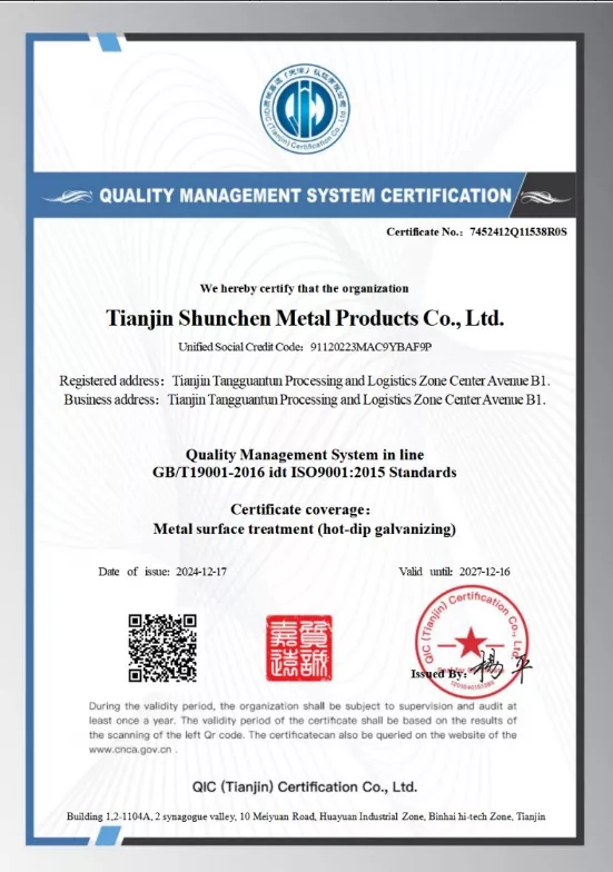 Syarikat Perindustrian Tianjin Shunchen telah mengumpul lebih tiga dekad pengalaman pengeluaran dalam industri keluli. Syarikat itu memegang pensijilan sistem ISO 9000, 3A, serta pensijilan CE Kesatuan Eropah, dan telah mewujudkan susun atur rantai perindustrian penuh daripada pemprosesan menggembleng kepada jualan dan pengedaran. Melalui aliran proses 12 langkah yang ketat dan mekanisme pemeriksaan komprehensif tiga peringkat, syarikat itu telah mencapai rekod sifar kemalangan kualiti dan keselamatan tahunan dan sifar pesanan mungkir selama 12 tahun berturut-turut. Perindustrian Shunchen mengekalkan inventori tempat keluli tergalvani sepanjang tahun melebihi 20,000 tan, membentuk pasar raya keluli tergalvani berskala besar yang mengintegrasikan pergudangan dan pengedaran. Gudang itu meliputi kawasan seluas 10,000 meter persegi, memberikan sokongan padu untuk perkhidmatan pengeluaran dan jualan bersepadu.