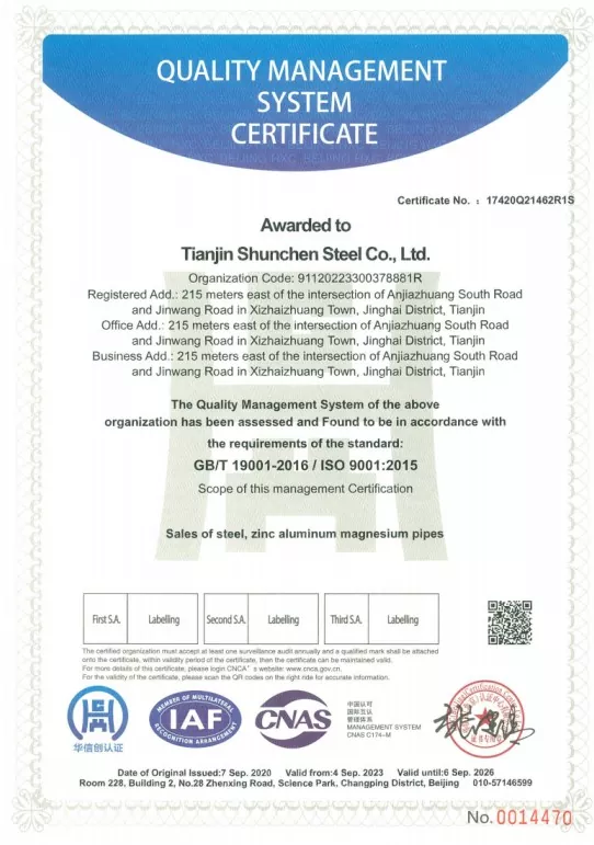 Bahagian U Keluli Perindustrian Shunchen telah memperoleh pensijilan kualiti ISO9001, memenuhi piawaian kebangsaan. Kami menyediakan laporan ujian bahan pihak ketiga dan sijil ketebalan galvanizing. Pengeluaran kami menggunakan barisan pengeluaran termaju, menjalani 12 langkah proses yang ketat, disokong oleh lebih 20 tahun kepakaran pengeluaran. Kami telah mengekalkan rekod prestasi 12 tahun sifar pelanggaran kontrak dan sifar insiden kualiti tahunan. Semasa proses pengeluaran, tiga rawatan pempasifan digunakan untuk meningkatkan rintangan anti-alkali produk tergalvani. Setiap produk siap menjalani pengeringan, pemeriksaan dan kemasan sebelum dibungkus dan dihantar. Syarikat itu memegang pensijilan sistem ISO 9000, 3A, dan pensijilan EU CE. Dengan 12 langkah proses kami dan mekanisme pemeriksaan komprehensif tiga peringkat, kami telah mencapai sifar insiden kualiti dan keselamatan tahunan dan mengekalkan rekod sifar pelanggaran kontrak selama 12 tahun.